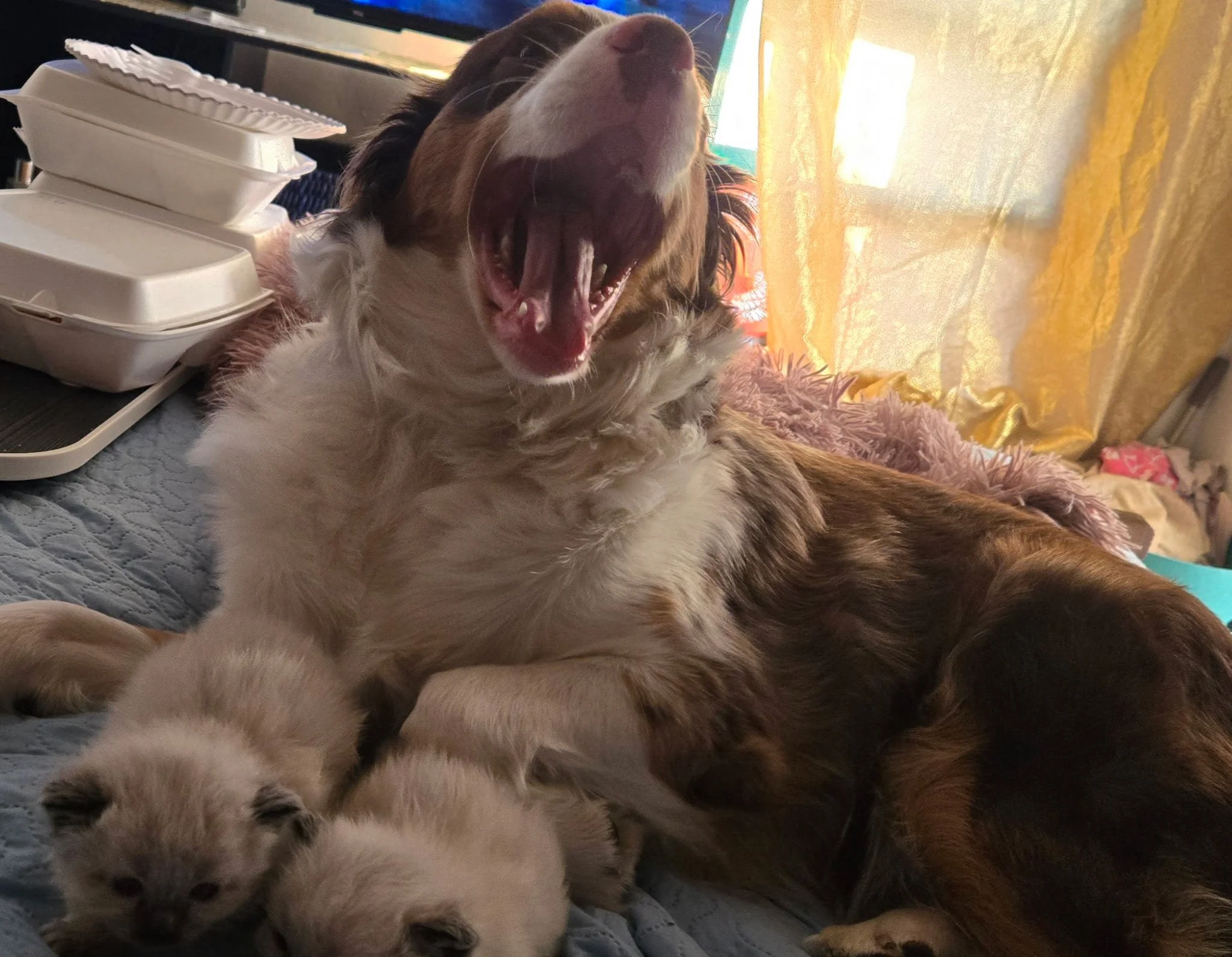 Our beloved Australian Shephard, Nova! So sweet, patient, and loves loving on and gently herding the babies.